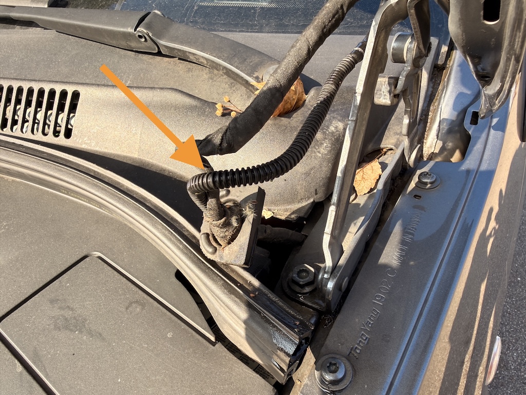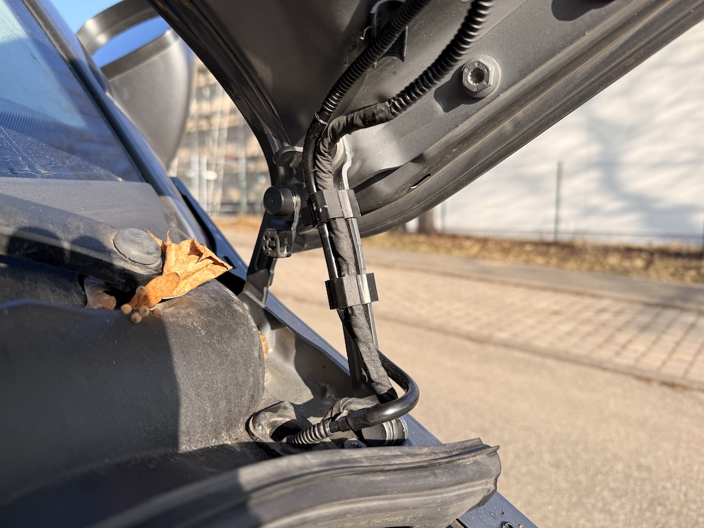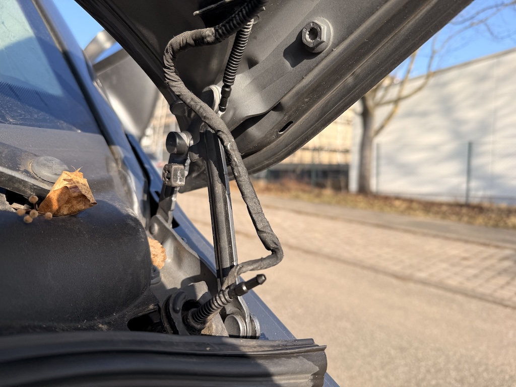Es war also klar, dass es ein Defekt sein musste und alle Hinweise verdichteten sich in Richtung des Schlauchs. Haube auf und die Schläuche an den sichtbaren Stellen abgesucht, diverse feuchte Stellen machten es nicht allzu schwer. Zum Glück (!) direkt am Scharnier der Motorhaube gebrochen, also an einer Stelle, an die man sehr gut rankommen würde. Nicht auszudenken, wie sich eine Reparatur gestaltet, wenn man weiter unten im Verborgenen eine Leckstelle hat.