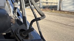 Jetzt zwischen die zwei offenen Enden ein Stück des neuen Schlauchs einpassen, der sich ungleich einfacher schneiden lässt, als der alte, und anschließend die Schläuche wieder mit den Halteklipsen am Gelenk / Scharnier der Motorhaube befestigen. Dann zwei, drei Mal die Motorhaube langsam und vorsichtig auf und zu: Scheint zu passen und knickt erst mal nicht!