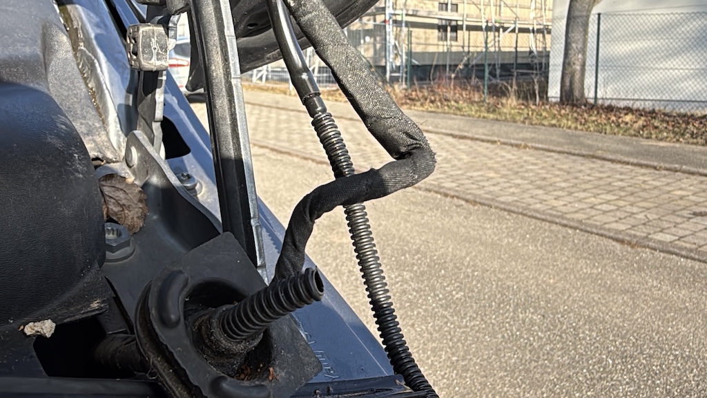 Es war also klar, dass es ein Defekt sein musste und alle Hinweise verdichteten sich in Richtung des Schlauchs. Haube auf und die Schläuche an den sichtbaren Stellen abgesucht, diverse feuchte Stellen machten es nicht allzu schwer. Zum Glück (!) direkt am Scharnier der Motorhaube gebrochen, also an einer Stelle, an die man sehr gut rankommen würde. Nicht auszudenken, wie sich eine Reparatur gestaltet, wenn man weiter unten im Verborgenen eine Leckstelle hat.